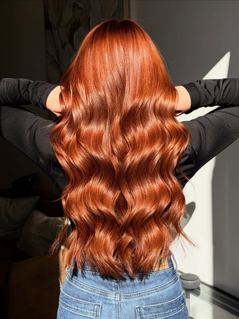 The hair color is the absolute star of this look. It’s a deep copper color that blends warm gold and brick red, appearing as bright as flames under strong light. This color not only greatly brightens the complexion but also gives the hair a metallic texture, making it a very popular fashion color in recent years. The light refracts strongly at the undulations of the waves, making the hair look as soft and shiny as silk. This texture usually requires deep nourishing treatments or salon-grade shine-locking treatments to achieve. The hairstyle features very regular S-shaped large waves. These curls are layered and progressive, with the turning points of each wave almost on the same horizontal line, creating a rhythmic and dynamic beauty. This curl retains the smoothness of straight hair while adding the liveliness and volume of curls.