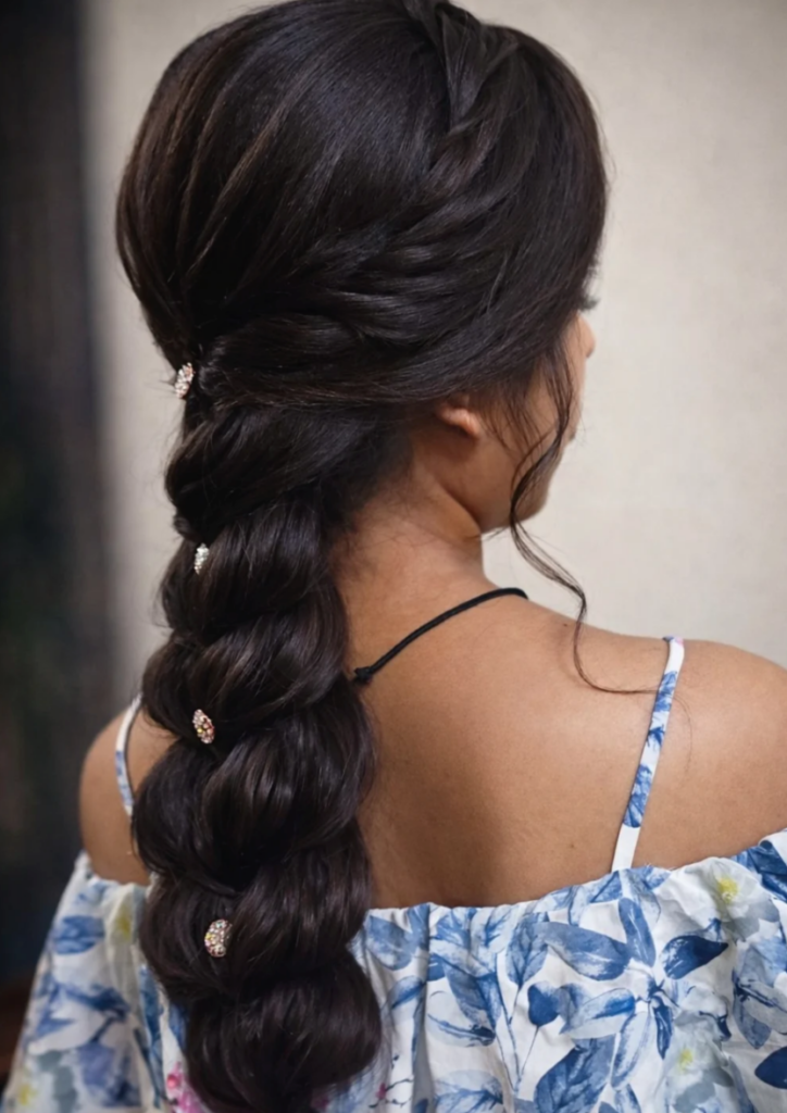 This hairstyle presents an exquisitely gentle and layered formal look, its core being the perfect fusion of the hair’s textured beauty and delicate accessories. The lower half of the hairstyle features an extremely voluminous and loose braid. The hair strands are styled like plump “bubbles” or rounded clouds; this loosening technique not only visually doubles the hair’s volume but also creates a very soft, non-aggressive texture, appearing both romantic and elegant. At each intersection and turn of the braid, a small, sparkling rhinestone hair accessory is embedded. These accessories, like pearls, adorn the dark hair strands, creating a subtle shimmer under the light. This “dot matrix” decorative method is more understated and refined than a single large hair accessory, adding a touch of glittering ceremony. Compared to previous hairstyles with striking colors or elaborate decorations, this one focuses more on the structural beauty of pure hand-woven braids, a typical “quiet luxury” formal look.