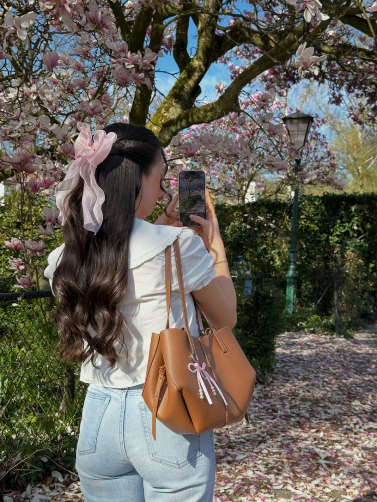 This hairstyle exudes an extremely romantic and fresh girlish charm, perfect for spring outings or flower viewing. It features a classic side-twisted half-up style. Twisting and securing the hair on both sides of the face maintains a clean facial appearance while providing excellent space for decoration at the back of the head. This structure adds a sense of flow from front to back to the naturally falling hair. The key visual element is the large, semi-transparent pink bow. The organza material is lightweight yet slightly structured, with long ribbons cascading down with the slightly curled hair, creating a dreamy atmosphere reminiscent of an oil painting. The bow’s color complements the cherry blossoms/magnolias in the background, making it the most important youthful element in the entire outfit. The hairstyle not only emphasizes the look itself but also creates an interesting connection with surrounding accessories. For example, the pink bow pendant on the bag perfectly echoes the headpiece. A single slightly curled strand framing the face provides excellent styling, making the profile appear more vibrant.