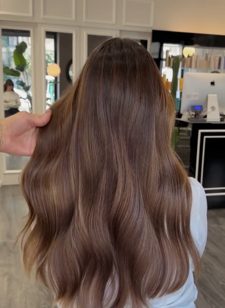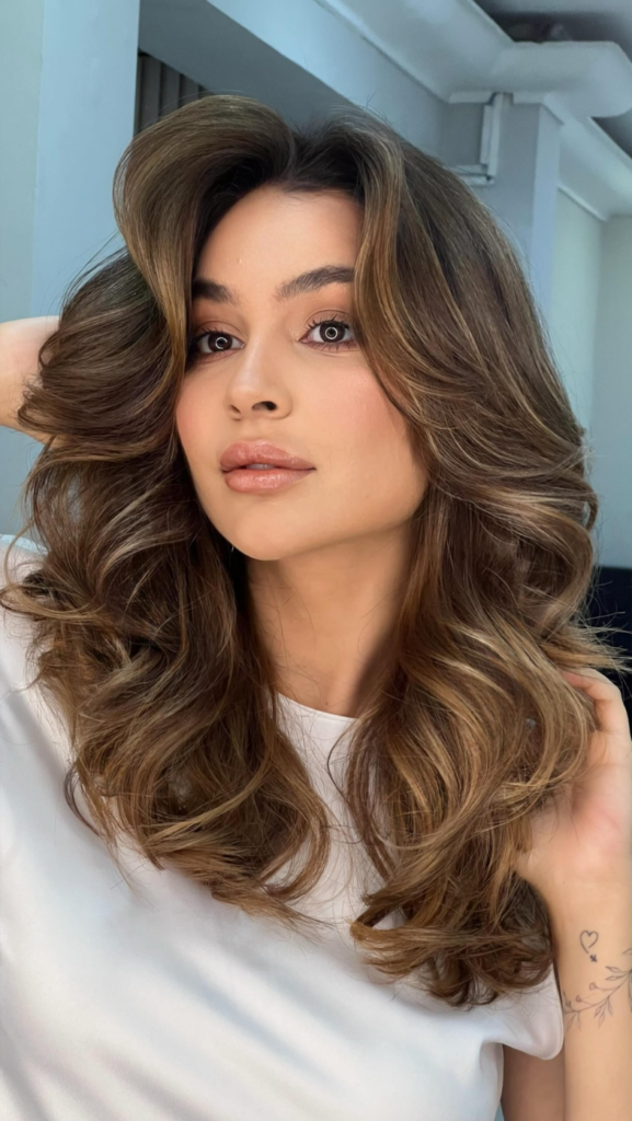 This hairstyle exudes a classic and sophisticated “Hollywood wave” feel, its most captivating feature being its silky, satin-like sheen. This is thanks to delicate Parisian coloring techniques, which allow deep mocha and warm caramel highlights to intertwine naturally, flowing and undulating with large, S-shaped waves. The cut features soft, layered contours, with long bangs that seamlessly connect below the cheekbones and curl outwards. This style not only perfectly frames the profile but also creates a mature and alluring yet light and bouncy modern urban feel, making it ideal for women who appreciate sophistication and presence.