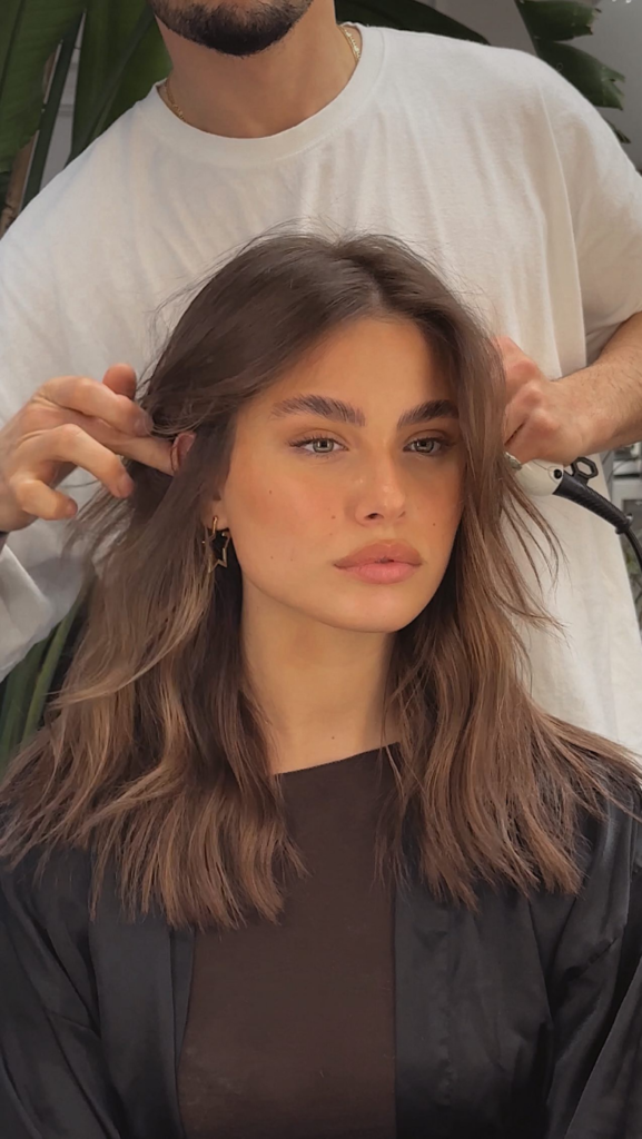 This is a typical “laid-back” style. It doesn’t pursue extreme smoothness or perfectly curled waves, but rather emphasizes the natural volume and tousled beauty of the hair. Combined with the model’s striking features and a simple black inner layer, the overall look exudes an intellectual, capable, yet gentle urban woman’s charm. The most prominent feature of this hairstyle is the high-layered, choppy cut. The hair strands aren’t uniform, but rather meticulously trimmed to create feather-light, delicate edges. This technique gives the hairstyle a very dynamic look, shedding the heaviness often associated with medium-length hair. The hair color chosen is a very soft cool tea brown or mocha brown. This color presents a sophisticated matte texture under natural indoor light, and combined with the subtle texture, it gives an effortless, “just woken up and already beautiful” aesthetic.