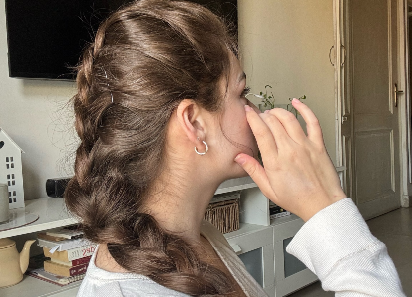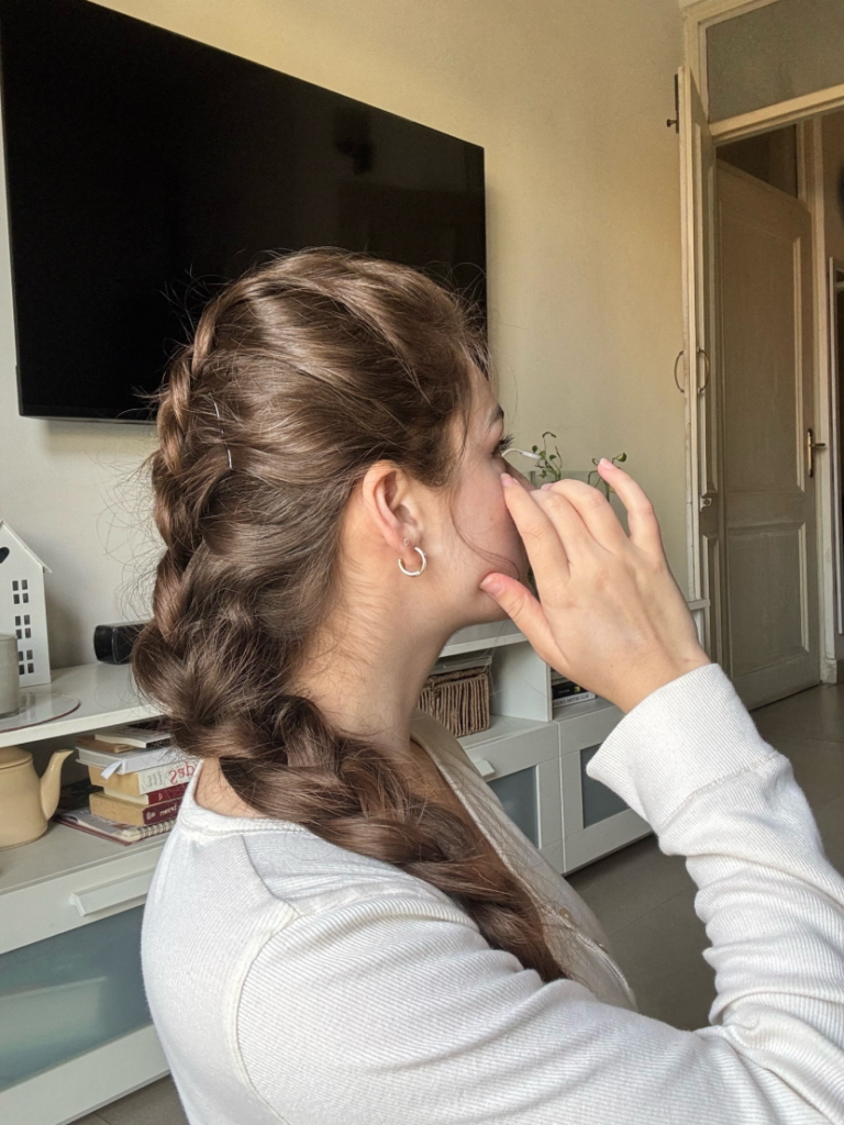 Compared to the previous two styles’ sophistication and competence, the core of this hairstyle lies in its approachable, homey feel and soft texture. This hairstyle begins with braiding from the top of the head, using a French braid technique, adding strands one by one. The braids converge at the nape of the neck and are then gathered on one side of the shoulder. This asymmetrical visual effect beautifully frames the face, adding a touch of gentle elegance. The braids are not taut; instead, the edges of each strand are intentionally loosened. This “loose” look creates a relaxed, natural atmosphere, seemingly unstyled yet layered. A very small metal hair clip or invisible clip is used on the side to secure any stray hairs. This tiny accessory echoes the small silver earrings, demonstrating meticulous attention to detail. This is a typical “five-minute hairstyle,” perfect for working from home, relaxing while reading, or everyday outings. Paired with a white knit top, the overall impression is clean, artistic, and approachable.