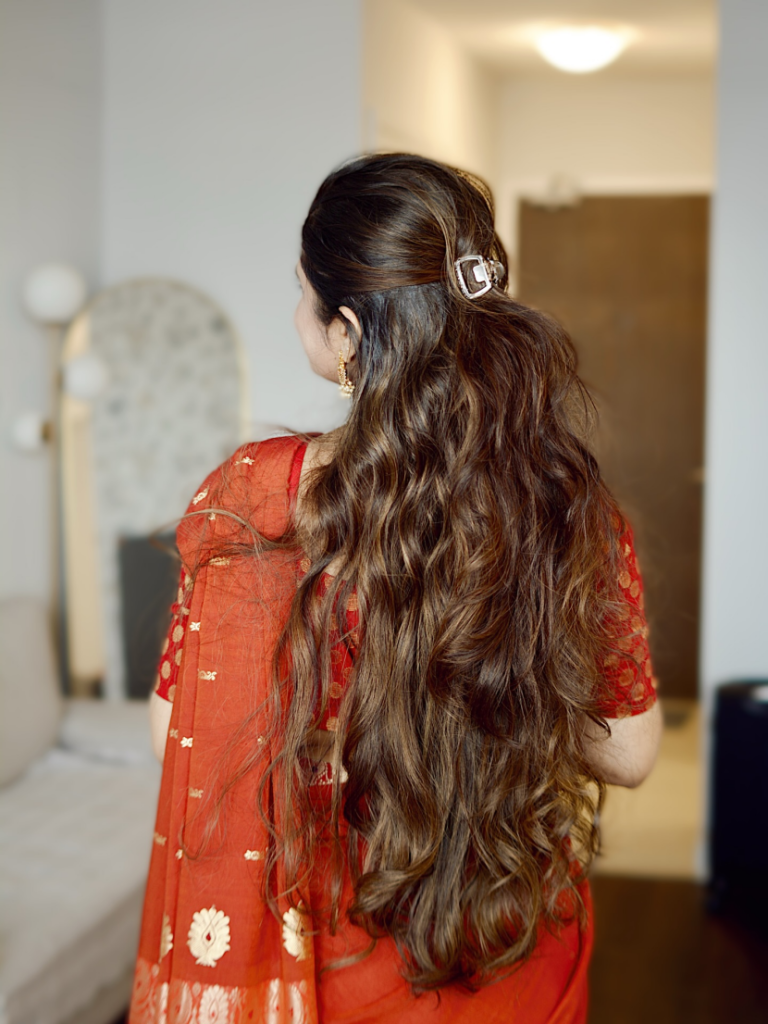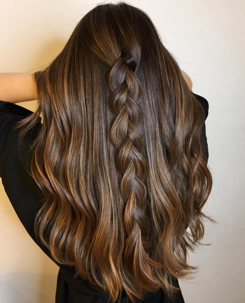 The focal point of this hairstyle is the thick braid at the back of the head. It employs a technique similar to French or Dutch braids, but each braid is meticulously rounded and voluminous. This “central axis” design elegantly gathers the upper section of hair while allowing the lower section to fall naturally, creating a layered half-up look. Hair color is the soul of this style. It uses a sophisticated dark brown base with caramel highlights. Lighter lines are precisely placed at the bulges of the braids and the curls at the ends, this contrast greatly enhances the braid’s three-dimensionality, making the otherwise flat hair appear like a work of art with flowing light and shadow. Unlike tight small curls, the lower part of this hairstyle features natural, wavy beach waves. The ends are light and airy, the curls not rigid but rhythmically swaying with body movements, giving a gentle yet stylish feel.