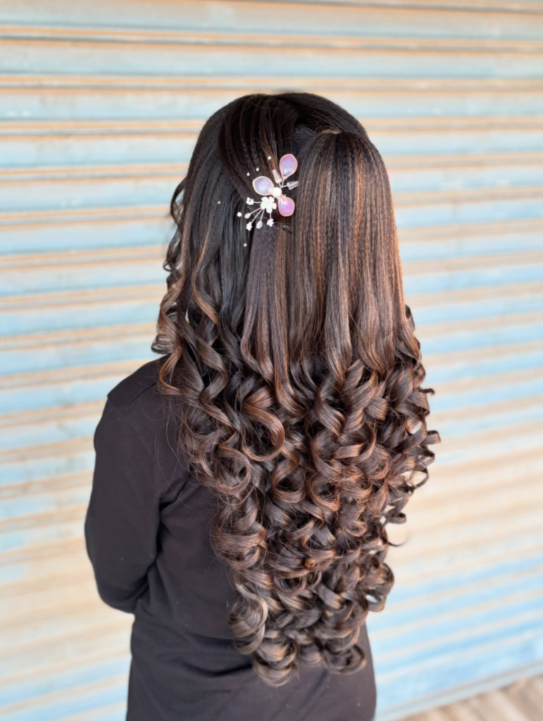 The upper half of the hairstyle is simply combed back and secured high at the back of the head with a delicate silver openwork clip. This style avoids elaborate braids, maintaining the natural texture of the hair, visually elongating the crown and adding roundness to the head shape, resulting in a look that is both energetic and unpretentious. The lower half features loose, long hair with tight, bouncy deep waves. These curls extend from the ears to the ends, creating a wave-like, voluminous effect. This dramatic visual impact is the core charm of this hairstyle, creating a romantic, languid, fairy-like atmosphere. The hair color uses a deep brown base with subtle light gold/caramel highlights. This color treatment captures light and shadow along the curls, making each curl very three-dimensional and avoiding the heaviness of long, thick hair, adding lightness to the overall style.