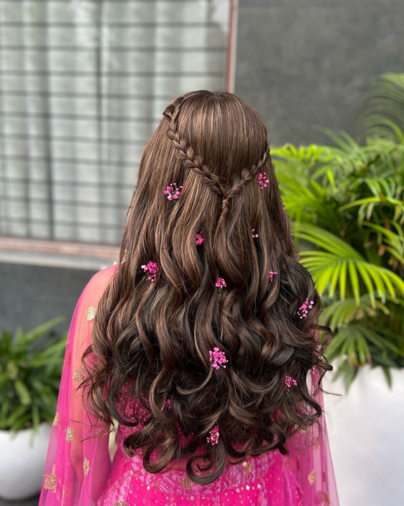 The upper half of the hairstyle features two long, thin braids that converge at the back of the head, forming an elegant “V” shape. This design helps to tighten the hairline, revealing the facial contours while preserving the flowing quality of long hair. The lower half of the hair features large, voluminous curls, giving it a thick and bouncy look. A dark brown base is accented with light gold accents. The curls intertwine these color blocks, enhancing the visual depth and shine. Small pink flowers are scattered throughout the curls, not concentrated in one place, but rather like stars, adding a touch of ethereal, dreamy fairy-like charm.