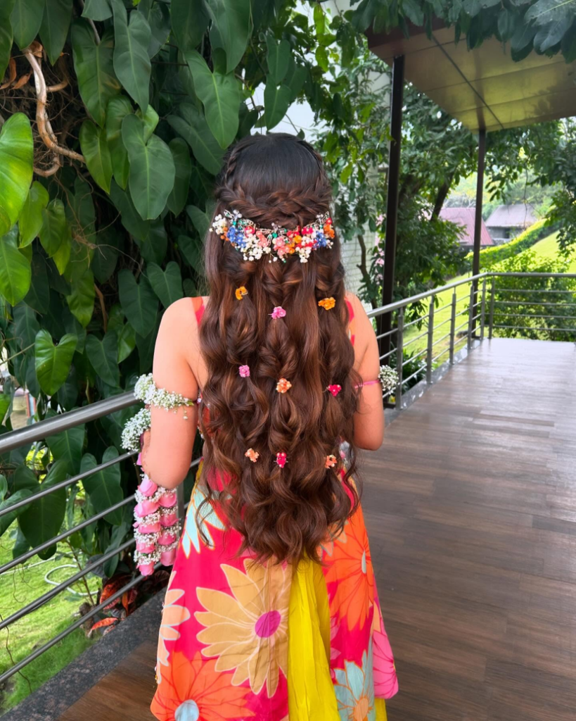 This hairstyle exudes a rich tropical feel and folk elegance. The upper part features an intricate braided design, with multiple braids intertwining at the back of the head to form a wide, horizontal braided band. This structure not only secures the hairstyle like a crown but also provides a perfect base for the lush floral decorations above, enhancing the three-dimensionality of the back of the head. This is the most eye-catching part of the entire look. At the junction of the braids, a cluster of extremely vibrant, colorful flowers is arranged horizontally, including small flowers in orange, pink, blue, and white, like a miniature floral carpet spread across the hair. This vibrant color contrast perfectly echoes the model’s brightly colored floral dress. Compared to the previous styles, this one takes the use of natural plant elements to the extreme, making it more than just a hairstyle; it’s a flowing work of art.