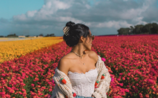 This hairstyle exudes a rich tropical feel and folk elegance. The upper part features an intricate braided design, with multiple braids intertwining at the back of the head to form a wide, horizontal braided band. This structure not only secures the hairstyle like a crown but also provides a perfect base for the lush floral decorations above, enhancing the three-dimensionality of the back of the head. This is the most eye-catching part of the entire look. At the junction of the braids, a cluster of extremely vibrant, colorful flowers is arranged horizontally, including small flowers in orange, pink, blue, and white, like a miniature floral carpet spread across the hair. This vibrant color contrast perfectly echoes the model’s brightly colored floral dress. Compared to the previous styles, this one takes the use of natural plant elements to the extreme, making it more than just a hairstyle; it’s a flowing work of art.