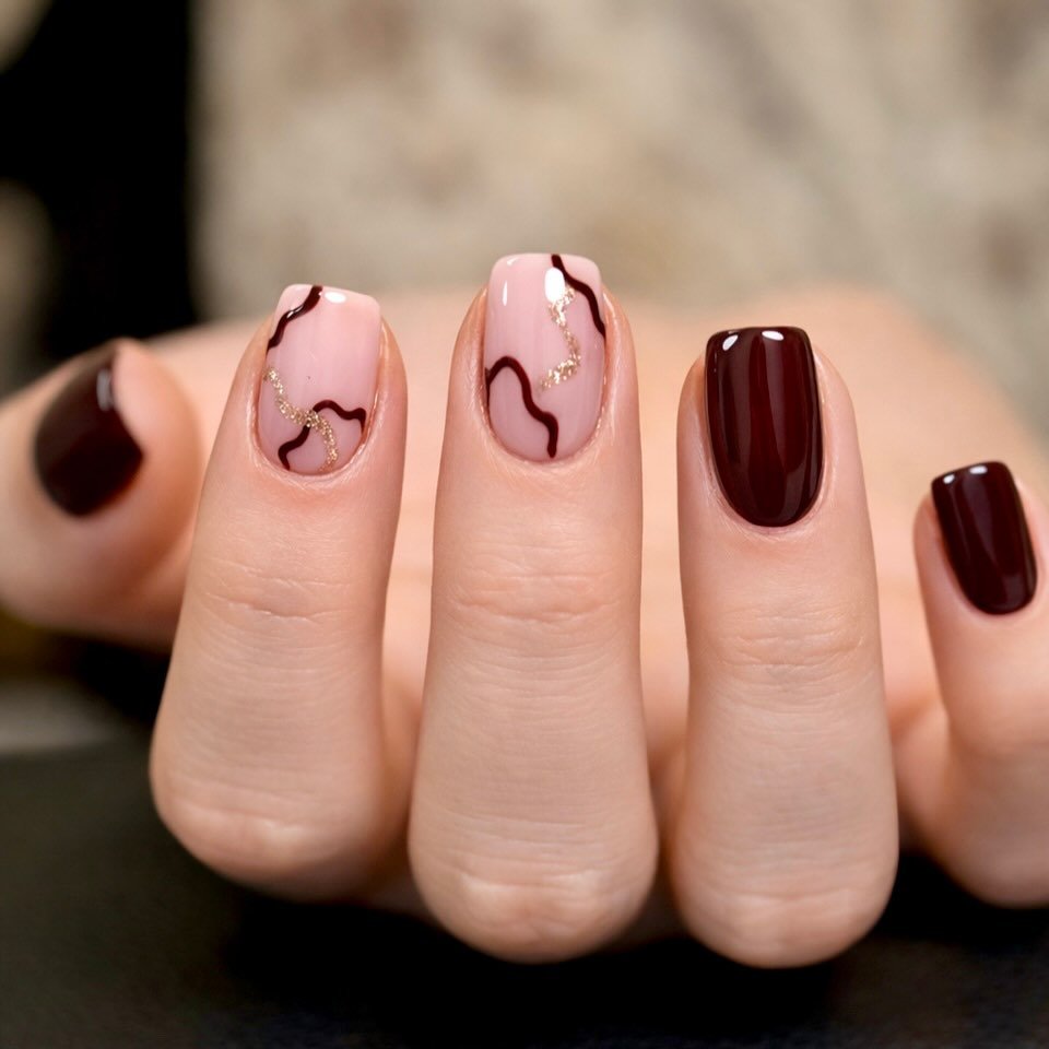 This nail look is a vintage-chic dream! Featuring champagne – gold cat – eye nails (glossy, shimmering like starry skies) with dark brown gradients at tips. Delicate gold hand – drawn lines add French flair. Perfect for dates/soirees—style with a silk dress or blazer. This nails idea blends timeless luxury with trendy cat – eye magic, ideal for elegance – seekers!