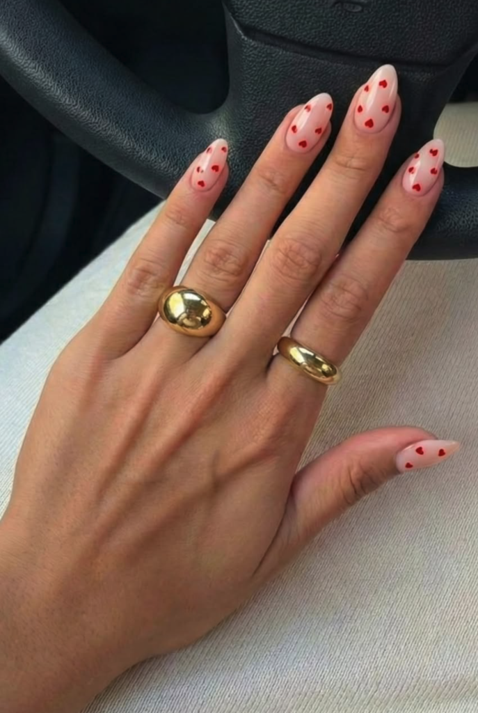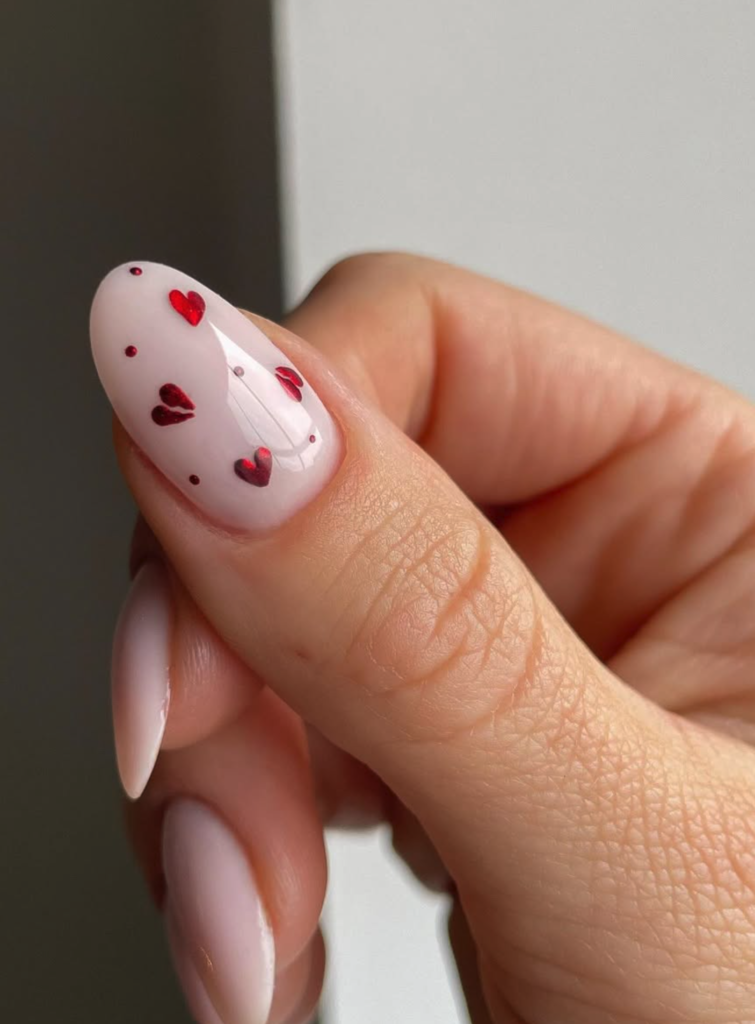 The style is soft, playful, and totally on-trend, blending a dreamy minimalist base with cute romantic accents. The base color? A sheer, jelly-like baby pink (think OPI’s “Bubble Bath” but with extra glow) that’s glossy and super flattering on all skin tones. Now, the star details: tiny hand-painted red hearts (in a vibrant, cherry-red shade, like Essie’s “Really Red”) scattered across the nail, plus dainty red dot accents that add just the right amount of whimsy without overdoing it. It’s fresh, feminine, and so versatile! Pair this with a flowy white sundress, a cozy pink knit, or even a denim jacket for that effortless “I tried but didn’t try” look. Whether you’re heading to a coffee date, a Galentine’s brunch, or a romantic dinner, these nails will have you feeling like the cutest cupid in the room—trust me, compliments guaranteed! 💅❤️