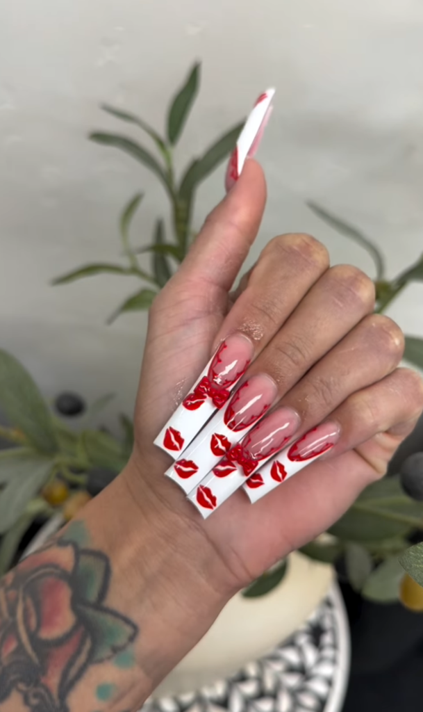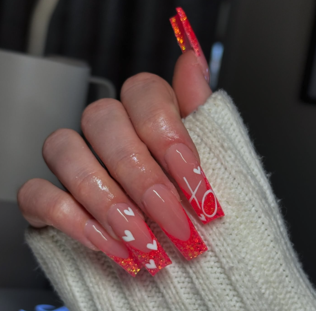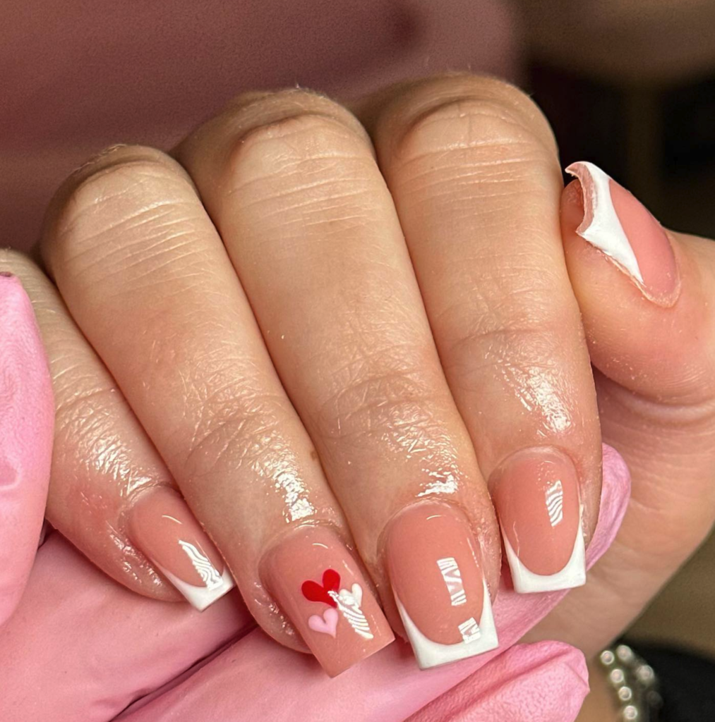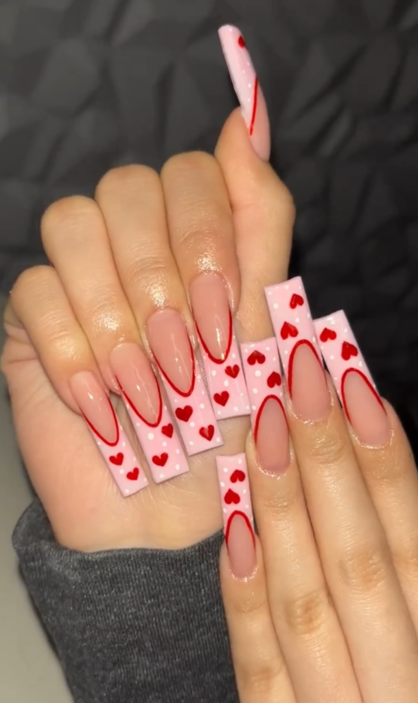 This set of valentines nails oozes romantic charm with a playful edge! The base blends a vibrant gel – red (think a bolder, glossier Ruby Woo) and a soft matte nude, while hand – painted tiny white hearts (some with negative – space detailing) pop like Cupid’s whimsical doodles. Textures? Glossy red meets velvety matte nude for eye – catching depth. For outfits, pair with a blush – pink lace dress (hello, love – drunk vibes) or a crisp white blouse + denim (casual date perfection). It’s ideal for Valentine’s dinner, rooftop parties, or even gifting “nail selfies” to your crush! The heart details feel intimate, yet the color contrast stays fun—perfect for leaning into love – day magic without being cheesy. Slay your nail game and your date night!