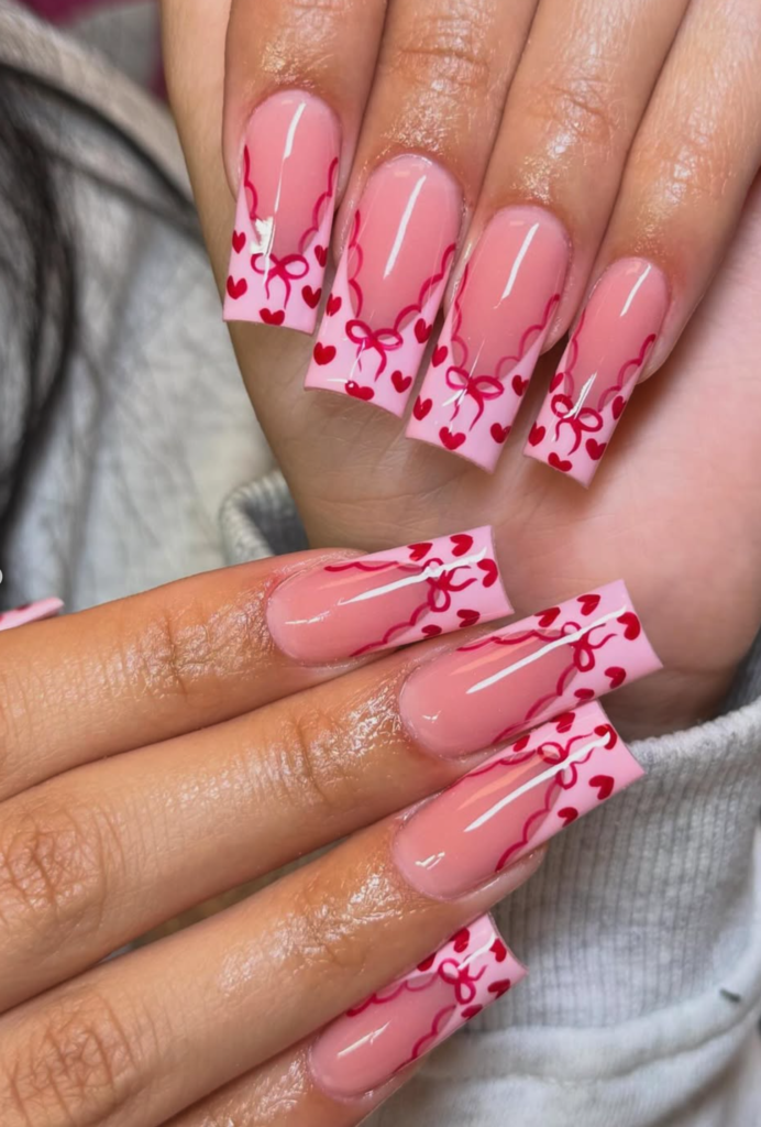 These Valentines nails are pure romance in every detail! The style is sweetly dreamy, featuring a soft pink gradient (from milky pastel to a deeper rose) with a glossy, jelly – like finish that glows like candy. Delicate hand – painted hearts (some dotted with tiny rhinestones for sparkle!) and subtle shimmer elevate the design—so charming for love – filled moments! Pair it with a lace midi dress, blush – toned knits, or a white satin blouse to amplify the feminine vibe. It’s perfect for date nights, Valentine’s parties, or even adding a tender touch to workwear (just keep outfits sleek!). Whether celebrating love or wanting pretty everyday flair, this mani steals hearts effortlessly!