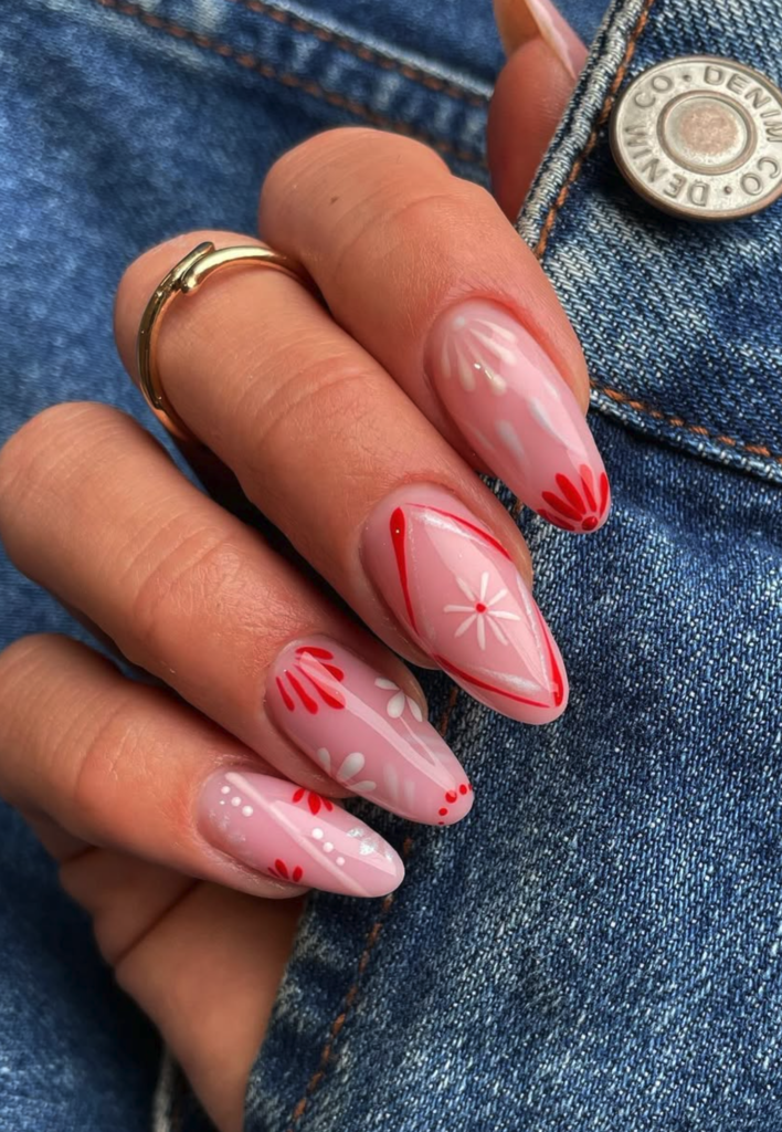 Fall in love with this dreamy soft-girl meets retro vibe mani—think milky baby pink jelly finish that’s *so* glossy, like a fresh strawberry milkshake in nail form! The details? Adorable hand-painted florals: dainty red curved lines, tiny white starbursts with red centers, and scattered red dots that add the cutest pop of color. It’s playful yet elegant, with that smooth, glass-like shine that catches light beautifully. Pair it with your go-to denim (hello, those jeans in the pic!), a crisp white tee, or a flowy pastel dress—total versatility! Perfect for coffee dates, brunch outings, or even a sweet Valentine’s Day look that’s not too over-the-top. Trust me, this mani will have everyone asking where you got it done!