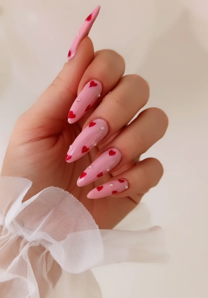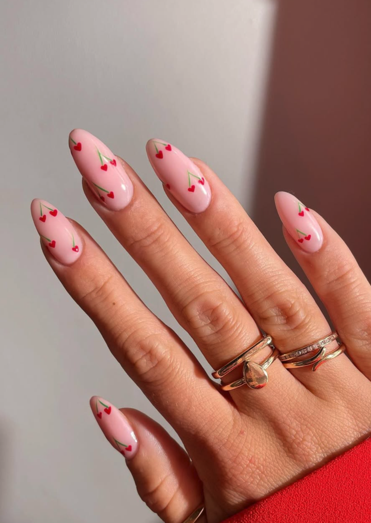The style here is total soft girl meets romantic charm—think delicate, feminine, and just the right amount of playful. The base is a creamy baby pinkwith a glossy, high-shine finish that catches the light beautifully. Now, the details? *Chef’s kiss.* Tiny hand-painted red hearts with dainty green stems are scattered across each nail, looking like little love notes—so cute and not over-the-top! This mani pairs *perfectly* with flowy white dresses, soft pink sweaters, or even a bold red top (hello, color coordination!). Whether you’re heading on a cozy date, grabbing brunch with friends, or celebrating Galentine’s, this look is versatile enough for everyday but special enough for Valentine’s Day. Trust me, your hands will be the star of every photo! 💅❤️