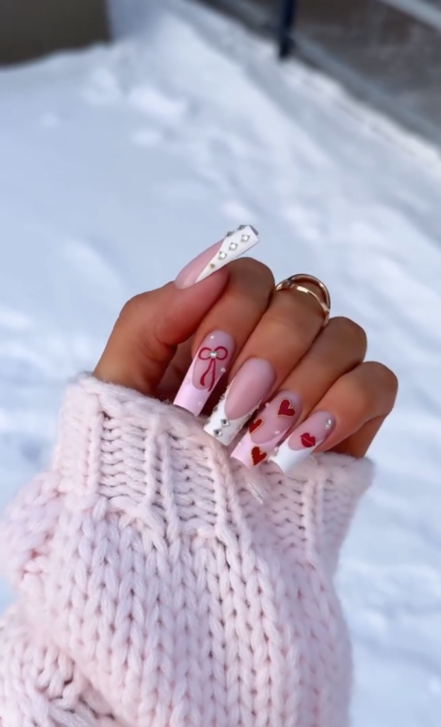 This set of valentines nails is all about sweet romance! The style blends cute hand – drawn details with a touch of glamour—think whimsical hearts and dainty bows in soft pinks and crisp whites, with a glossy (almost jelly – like) finish that makes the colors pop. Sparkling rhinestones add a bit of bling, perfect for catching light on date nights. For outfits, pair with a frilly pink dress or a lace – trimmed blouse to amp up the romantic vibe. Whether it’s a Valentine’s dinner, a girls’ night out, or a dreamy date, these nails will make you feel like the main character of a love story!