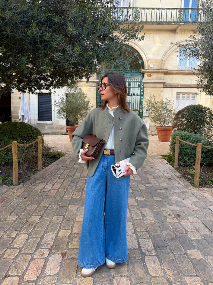 This is a classic French-style casual look that feels both comfy and high-end. It features a muted grey-green jacket paired with classic light-wash wide-leg jeans and a cream knit top. The soft colors give off a lovely vintage vibe.