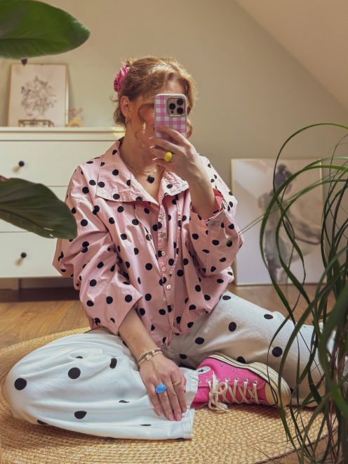 This outfit is all about polka dots! It features a pink shirt with black dots paired with light grey wide-leg pants that have the same pattern. The two pieces match perfectly while keeping the colors distinct, making the whole look fun and balanced.