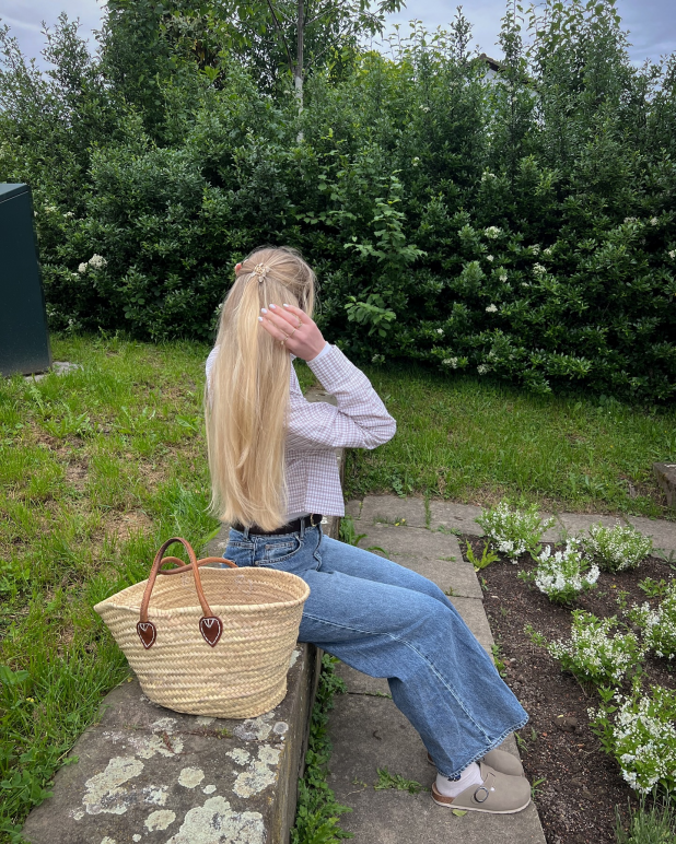 This is a French-style casual look that’s simple, timeless, and super comfy. It features a light checkered shirt with classic light-wash wide-leg jeans. Paired with light grey Birkenstocks and a straw bag, the soft and clean colors give off a fresh spring vibe that’s both gentle and chic.