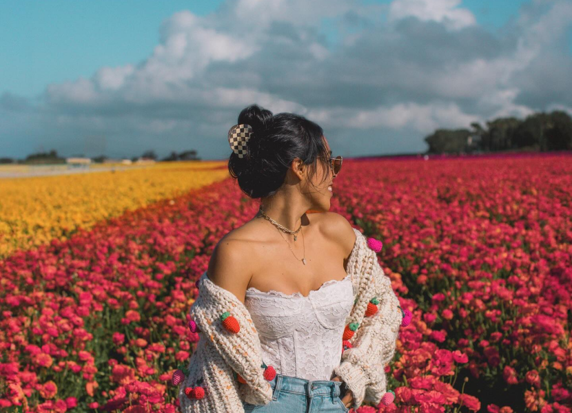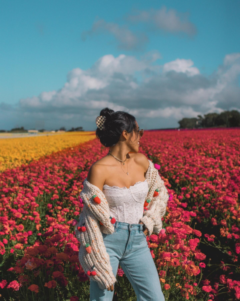 The combo of a chunky cardigan and jeans gives off a laid-back, vacation vibe. It’s the perfect look for taking photos outdoors, whether you’re in a field of flowers or at the beach.