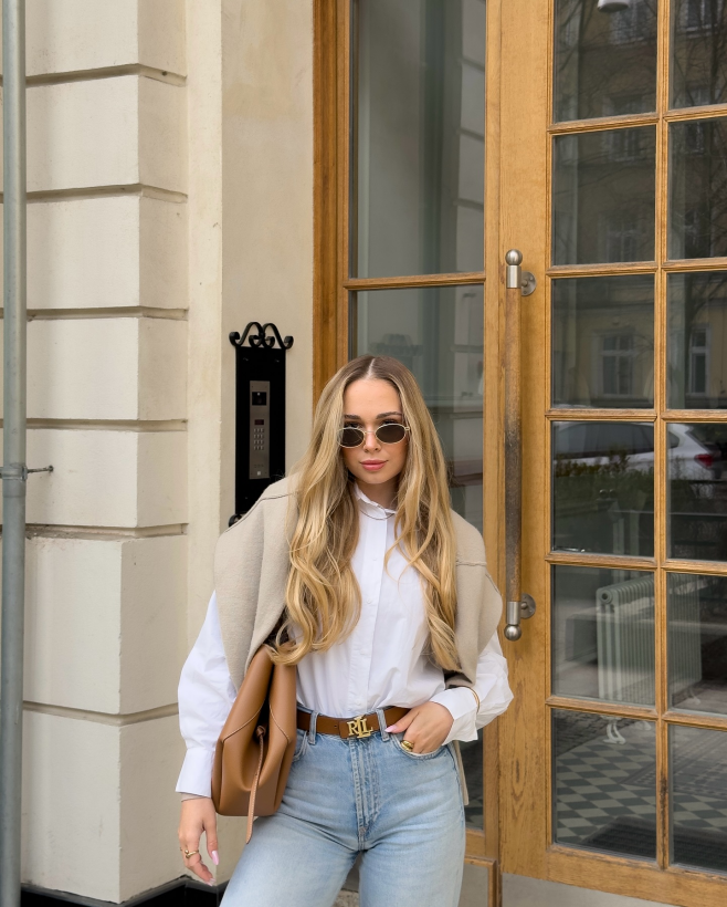 The crispness of the loose white shirt balances out the casual vibe of the jeans. The light beige coat matches perfectly with the brown belt and tote bag, which really levels up the overall quality and sophistication.