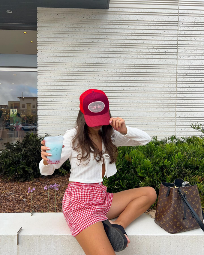 This outfit is a vibrant American retro “sweet and cool” look. It centers around red-and-white checkered shorts paired with a white cropped tie-front knit top. The classic red-and-white combo is fresh and really pops. The cropped cut lifts your waistline, making your body proportions look sharp and balanced.