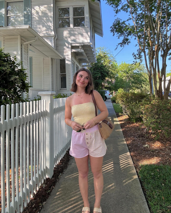 This outfit is a fresh and soothing American country casual look. It pairs a pale yellow knit tube top with pink-and-white striped shorts. These soft pastel colors give off a lovely spring vibe. The tube top shows off your shoulders and neckline for a fresh, slightly sexy look, while the high-waisted shorts make your legs look longer.