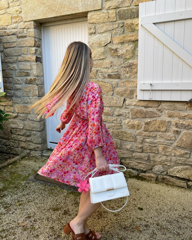 This outfit is a bright and romantic French-style girlie look. It features a pink floral chiffon dress with a cinched waist and puff sleeves. The light, flowy fabric shows off your waistline while looking soft and youthful.