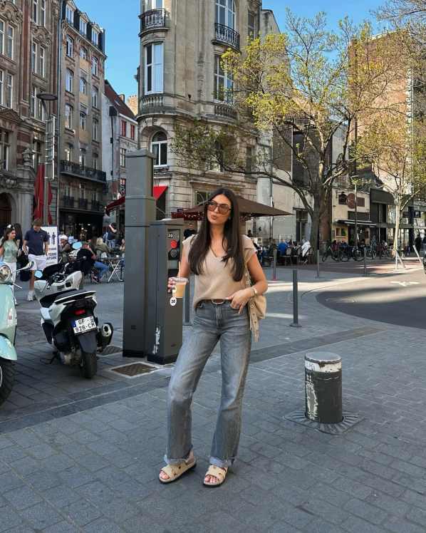 The V-neck design shapes your neckline beautifully, while the high-waisted jeans with cuffed hems help lengthen your legs. Paired with matching Birkenstocks and a fringe shoulder bag, it adds a relaxed, laid-back vibe.