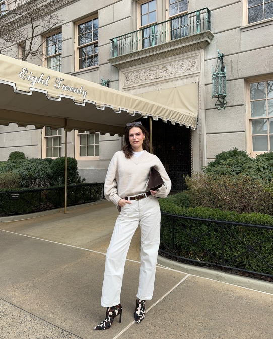 This outfit is a perfect example of minimalist urban chic. It pairs a loose, light beige V-neck sweater with white high-waisted straight-leg pants. The soft, cozy knit balances perfectly with the sharp pants, creating a look that’s both comfy and professional.